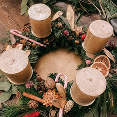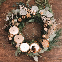 In unserem Workshop binden wir zusammen spektakuläre Adventskränze in klassisch runder Form. Alle Materialien liegen hier schon für Euch bereit und warten nur darauf, Ihren Platz auf Euern Weihnachtskränzen zu finden: Herrliche Farbtöne, Kieferästchen, aromatischer Eukalyptus, saftiges Tannengrün, rustikale Zapfen, schimmernde Weihnachtskugeln, Trockenblumen und viele andere stimmungsvolle Accessoires. Ob aus Euern Weihnachtskränzen am Ende des Kurses ein Adventsgesteck für den Tisch oder für die Tür wird, liegt ganz bei Euch. Auf Wunsch können passende Kerzen zusätzlich bei uns erworben werden.