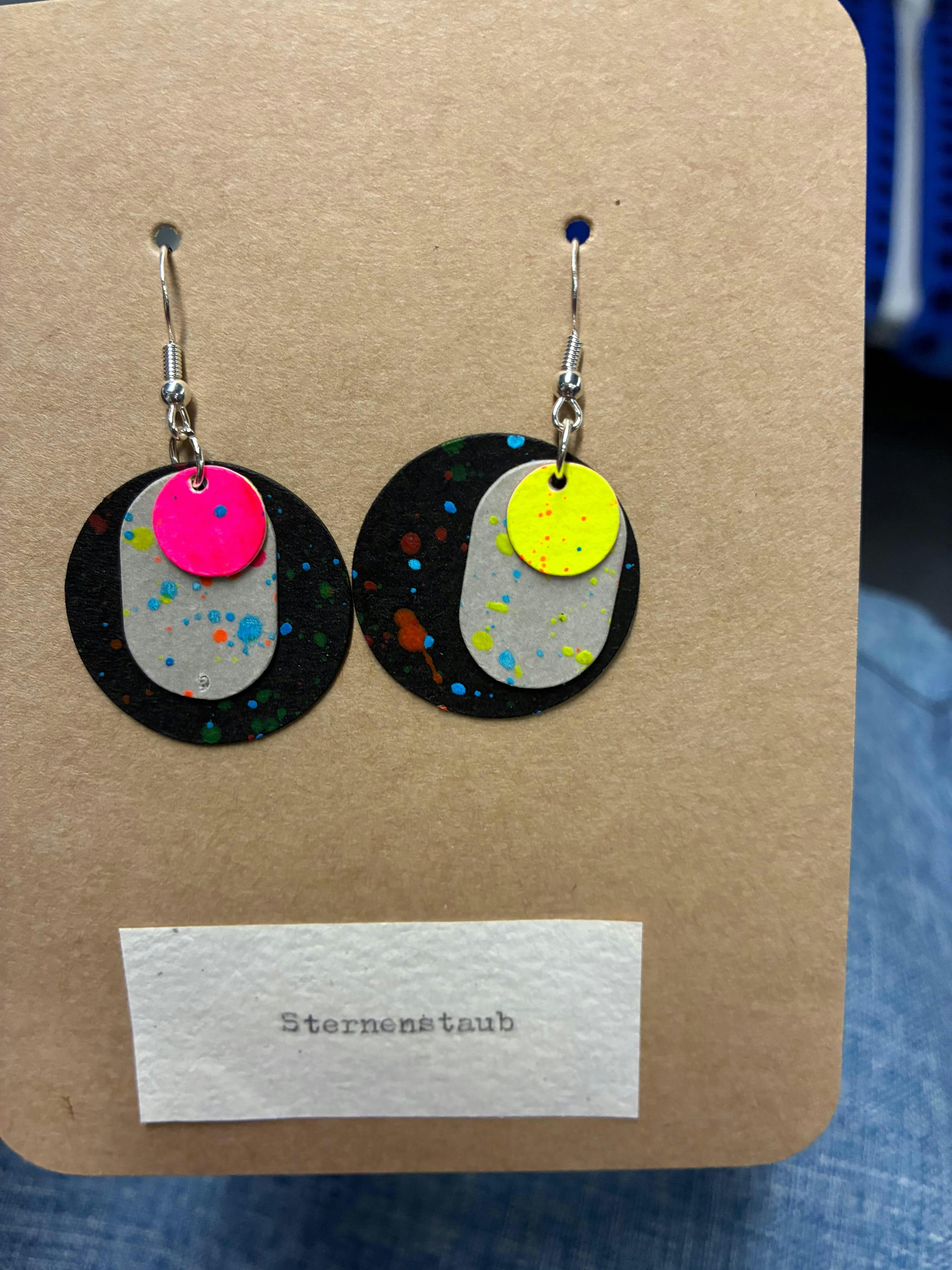 Runde Ohrringe aus veganem Leder in Gelb, Pink und Grau auf gelbem Hintergrund – nachhaltiger Schmuck Workshop