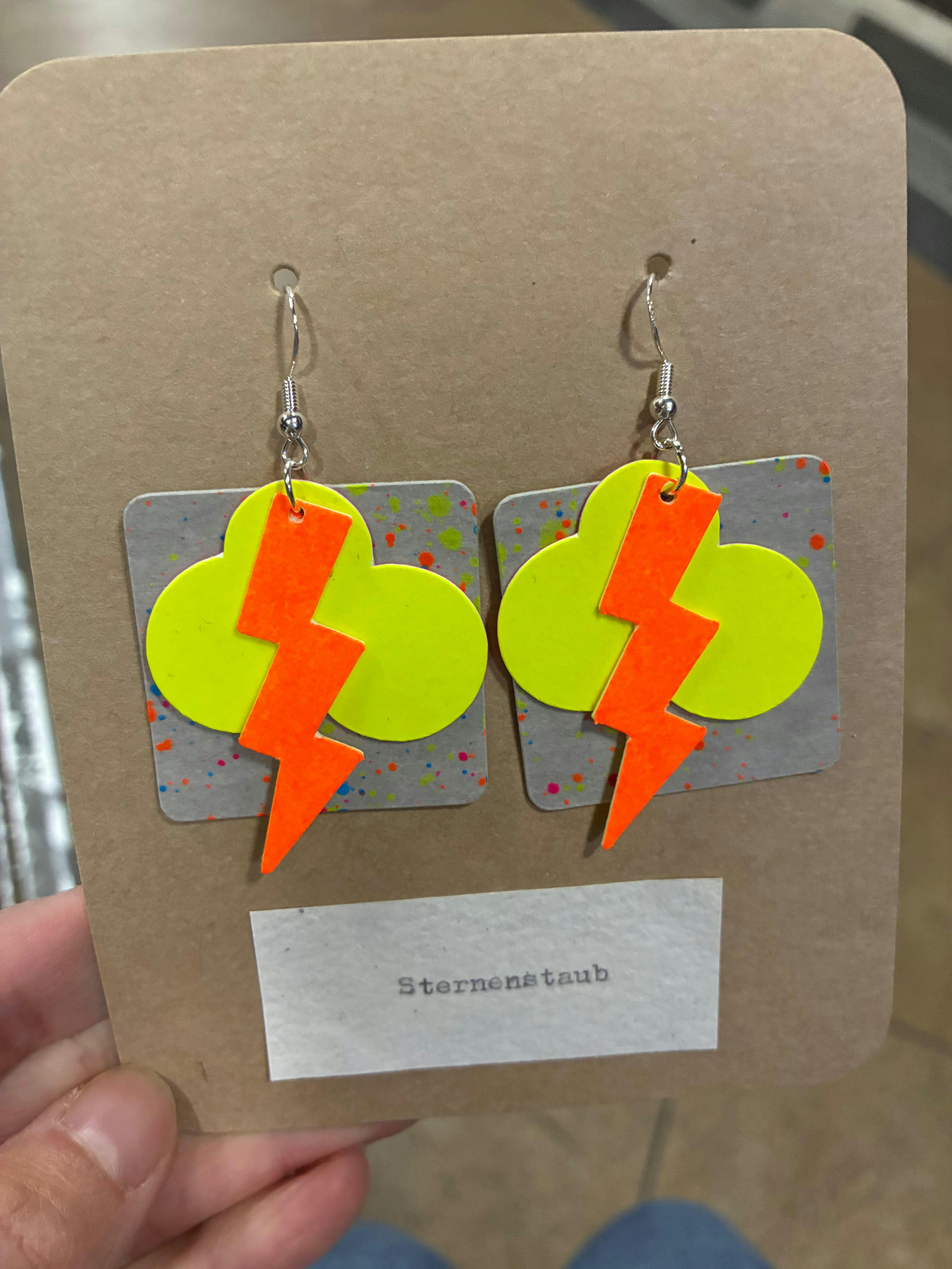 Neon-gelber Hintergrund mit bunten Blitz-Ohrringen aus veganem Leder – DIY Schmuckworkshop.